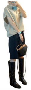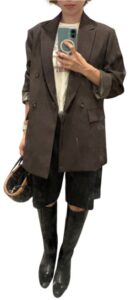 大きめテーラードジャケットを使ったコーデ。ハーフパンツで今年らしい新鮮味が加わっています。ジャケットの袖まくりも効いていますね。お手持ちのロングブーツを生かした今年らしいコーデが組めています。