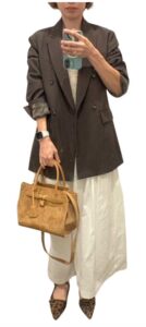 ジャケット以外はすべてすでにお持ちだったお洋服でのコーデ。フレアのロングスカートに大きめ&長めのジャケットを羽織ってもバランスが綺麗、むしろカッコよく仕上がるのがナチュラルタイプです。素敵ですね。