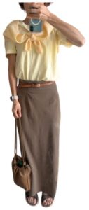 こちら、お子様とお出かけの際のバウンドコーデだったそうなのですが、とっても素敵でした。イエローのTシャツに同系色の肩掛けカーデ。同じ色を繰り返し用いることでコーデの深みは出つつ統一感が崩れないgoodな技が効いています。さらにスカートにはお手持ちの細ベルトをオン。バッグとサンダルはスカートと同系色に。物の数が多いのにまとまって見えるのは同じカラーを繰り返し用いているからですね。素敵コーデでした!