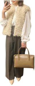 先ほどのコーデとは打って変わって、小物類はすべてベージュで揃え、優しい印象に。可愛い要素は残しつつ、色の淡いグラデーションで幼すぎない雰囲気です。特に女子会ではとっても褒められそうなコーデです。