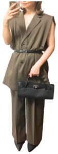 流行りのベロアのトップスは見た目が美しい生地感の物をチョイス。細ベルトが背中がアジャスターになっているものを選び、華奢な方でも余りがなくスッキリと使えるように。すでにお持ちだった横長のバッグとも好相性でした。