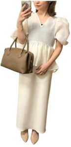 こちらは色も形もデザインも、スペックに合致する大変お似合いなコーデでした。小柄&華奢さんでも、ロングタイトを入れると子供っぽくなくサラッとパフスリーブコーデが決まります。