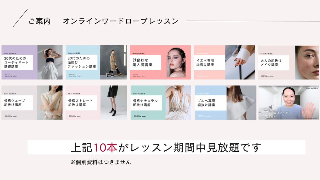 パーソナルカラー診断も骨格診断も顔タイプ診断も全部受けたけどやっぱりいまいち垢抜けなかったという方は、ぜひStudio Noriの「オンラインワードローブレッスン」にお申込みください。
